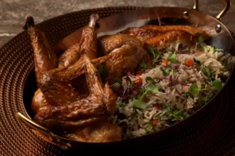 Hidangan ini disajikan bersama truffle pilaf yang ringan dan gebu, serta sos peri-peri buatan sendiri yang cerah dengan cuka dan pedas dengan cili hancur. Gabungan ini mencipta pengalaman makanan yang memuaskan jiwa - kulit rangup, daging sedap, nasi beraroma bumi dan kepedasan yang tiba-tiba.