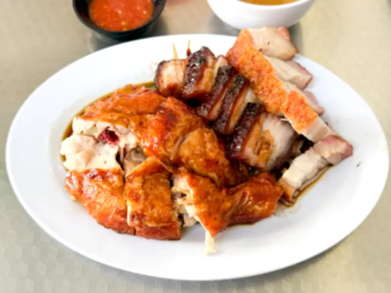 Setiap hari, terdapat pelbagai ayam (rebus dan panggang), daging babi panggang dan char siu. Angsa panggang juga boleh dipesan terlebih dahulu. Walaupun mereka dibuka awal pagi, datang sekitar pukul 11 pagi untuk mendapatkan daging panggang panas dari ketuhar. Untuk meletakkan harga dalam perspektif: sepiring nasi dengan sayap ayam panggang atau rebus boleh serendah RM5, manakala hidangan char siu atau daging babi panggang dengan nias berharga RM9.50. Kombinasi dua daging berharga antara RM9.50 hingga RM11, bergantung pada bahagian ayam. Hidangan utama adalah kombinasi tiga: paha ayam panggang, char siu dan daging babi panggang yang boleh mencecah RM15.